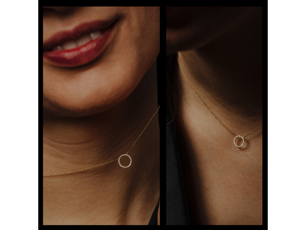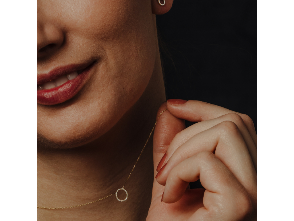 Nežný, ženský, trblietavý zlatý náhrdelník, ktorý pôsobí sviežo a mladistvo no zároveň elegantne a luxusne. Podtrhne Vašu charizmu a každý Vám ho bude obdivovať. Briliantový krúžok je pripevnený priamo na retiazke, takže nehrozí, že sa z nej zošmykne, čo uľahčuje nosenie i manipuláciu. Tento typ šperku si získal veľkú fanúšikovskú základňu práve pre svoju univerzálnosť a pohodlnosť. Krásny dar, verte nám.