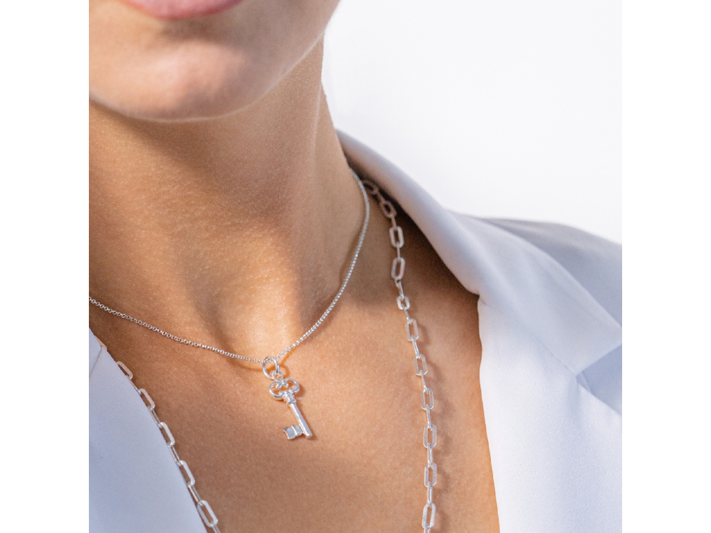 Kľúč na krku, to je šperk s dlhým príbehom. Kedysi bol skôr praktickou záležitosťou, no kvôli tajomnu, ktoré ukrýva a vďaka svojej symbolike sa stal malý kľúčik na retiazke ikonickým šperkom. Strieborný kľúčik je na tenkej, no pevnej retiazke, ktorú si môžete vybrať vo viacerých dĺžkach.
