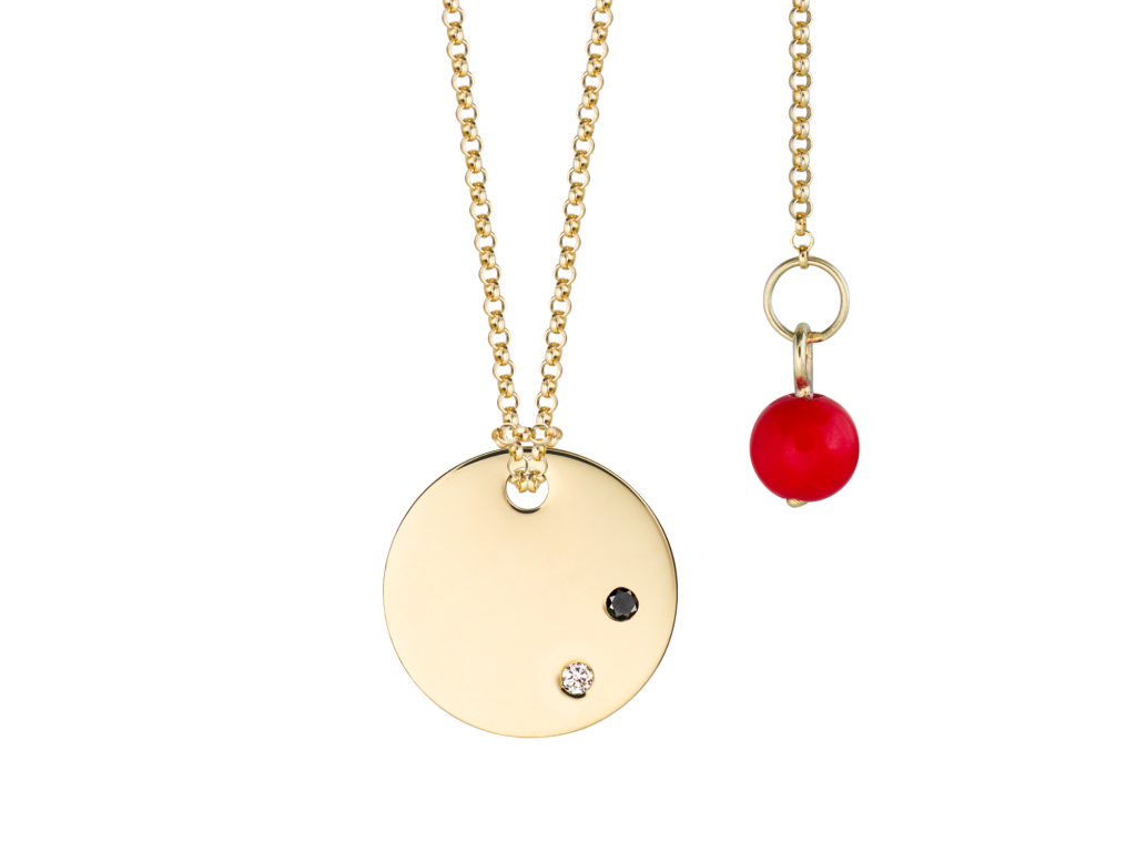 Štýlová masívnejšia 13 mm platnička z klasického žltého zlata s dvoma diamantmi. Čierny a biely briliant odkazuje na balans v živote alebo aj inak :) "Bez noci nie je deň". Rozhodnite sa či medailón zostane čistý alebo bude s gravírovaným menom. Medailón je pripevnený na kvalitnej retiazke zo žltého zlata zakončenej guľôčkou z červeného koralu, ktorý podľa starej tradície nositeľa ochraňuje. Tento dizajnový zlatý šperk sa stane Vašim osobným talizmanom a nezáleží na tom, či ho dostanete ako dar alebo si ho doprajete sama.