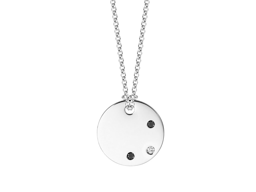 Minimalistická guľatá platnička z bieleho zlata s jedným bielym a dvoma čiernymi diamantmi. Táto kombinácia farieb briliantov odkazuje na balans v živote alebo inak :) "Bez noci nie je deň". Jemná, no kvalitná retiazka z bieleho zlata je zakončená červeným koralom. Ten je nielen rafinovaným akcentom ale podľa starej tradície chráni nositeľku pred negatívnou energiou (naozaj:). Trom diamantom môžete dať symboliku - Vy dvaja a Vaša ratolesť alebo Vaše dve deti a Vaša polovička alebo ste matka-hrdinka s troma pokladmi. Tento náš autorský šperk sa stane Vašim osobným talizmanom a nezáleží na tom, či ho dostanete ako dar alebo si ho doprajete sama.