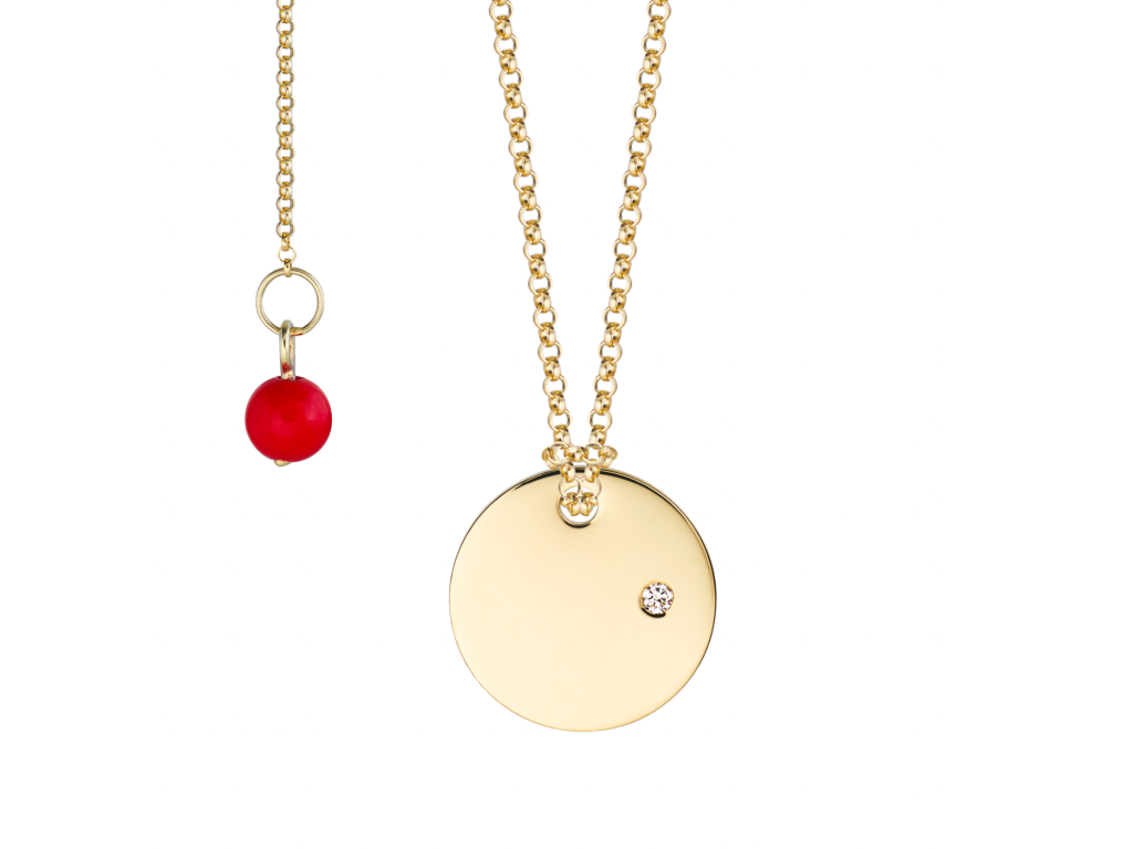 Krásny minimalistický medailón zo žltého zlata s certifikovaným diamantom. Tento nadčasový šperk môžete nosiť čistý alebo Vám naň vygravírujeme meno, dátum či iniciálky podľa Vášho želania. Medailónik je na jemnej, no kvalitnej a pevnej retiazke zo žltého zlata. Zlatú retiazku sme zakončili červeným koralom, ktorý podľa starej tradície nositeľa ochraňuje. Šperk ako stvorený na to, aby bol darom pre milovanú osobu.