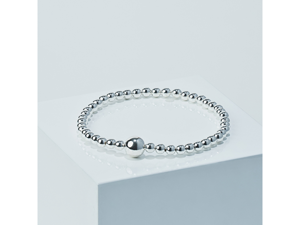 Veľmi milý šperk na každodenné nosenie. Pružný, guľôčkový náramok z pravého striebra na gumičke zo špeciálneho silikónu si ľahko navlečiete na ruku. V strede náramku je jedna väčšia strieborná perla. Tento trendy náramok si priam pýta kombináciu s inými náramkami. Či už to budú tie Vaše obľúbené, alebo tie z našej kolekcie VIVRE - elastický náramok LYA či GALLA.