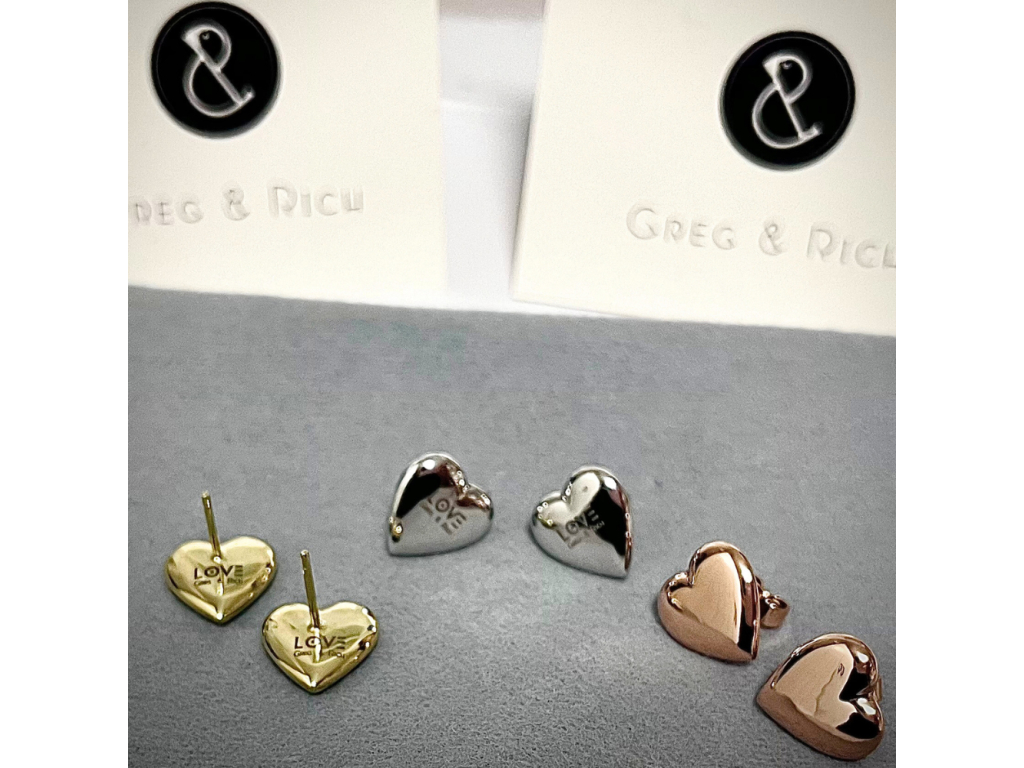 V pracovnom stole našich zlatníkov si pokojne ležala približne 50 rokov stará raznica v tvare srdca. Prehovorila na nás prostredníctvom silnej emócie v podobe radosti a úcty k starým slovenským zlatníkom ...a tak sme ju vrátili späť do života. Spravili sme si z nej také naše malé posolstvo lásky od Greg & Rich. Tieto náušnice sú nabité pozitívnym nábojom sú nadčasové a vyrobené zo 14 karátového zlata. Hodia sa k akémukoľvek outfitu a na akúkoľvek príležitosť. Sú nádherným statement šperkom. Náušnice LOVE budú krásnym darom z lásky. Z opačnej strany náušníc je vygravírovaný nápis LOVE v našom brandovom fonte s mini logom Greg & Rich. Každé srdce je ručne vyrobené prostredníctvom vretenového lisu našimi šikovnými zlatníkmi. Krásna precízna a tradičná zlatnícka práca.